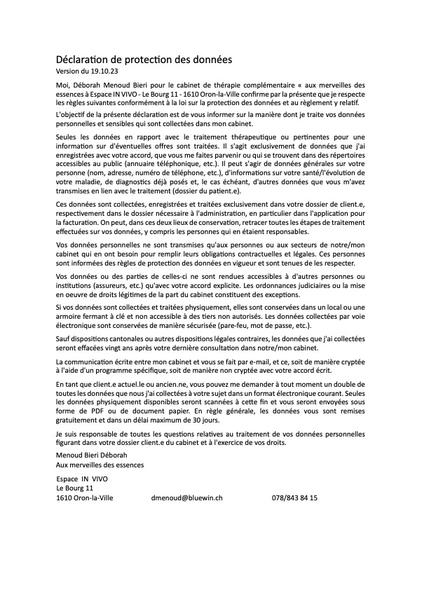 Moi, Déborah Menoud Bieri, pour le cabinet de thérapie complémentaire Aux Merveilles des Essences — Espace IN VIVO, Le Bourg 11, 1610 Oron-la-Ville — confirme par la présente que je respecte les règles suivantes conformément à la loi sur la protection des données et au règlement y relatif.